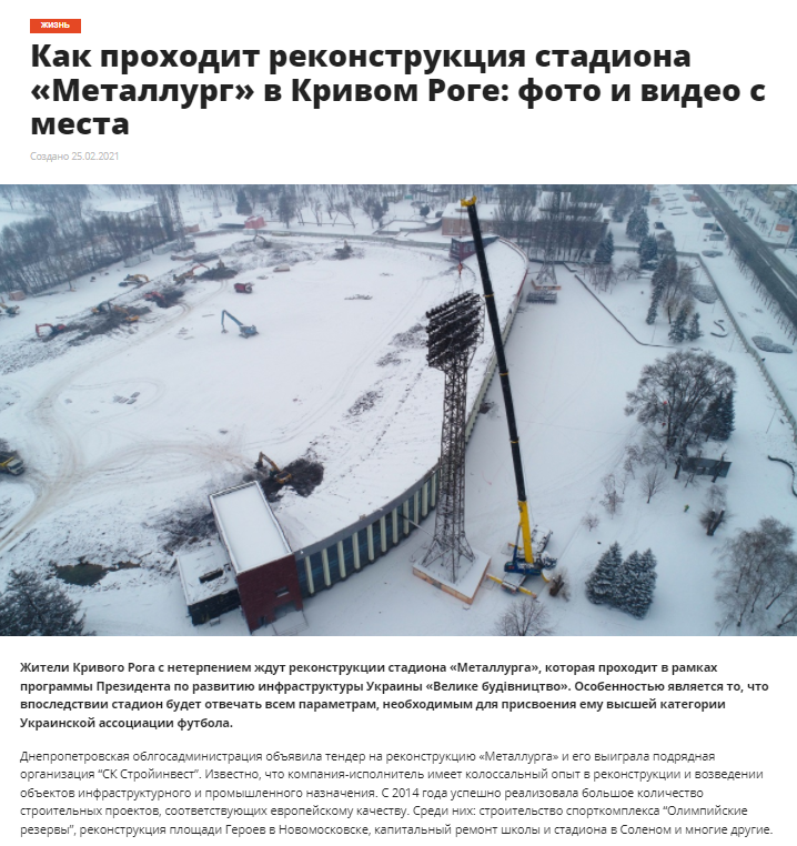 Жители Кривого Рога с нетерпением ждут реконструкции стадиона «Металлурга», которая проходит в рамках программы Президента по развитию инфраструктуры Украины «Велике будівництво». Особенностью является то, что впоследствии стадион будет отвечать всем параметрам, необходимым для присвоения ему высшей категории Украинской ассоциации футбола.