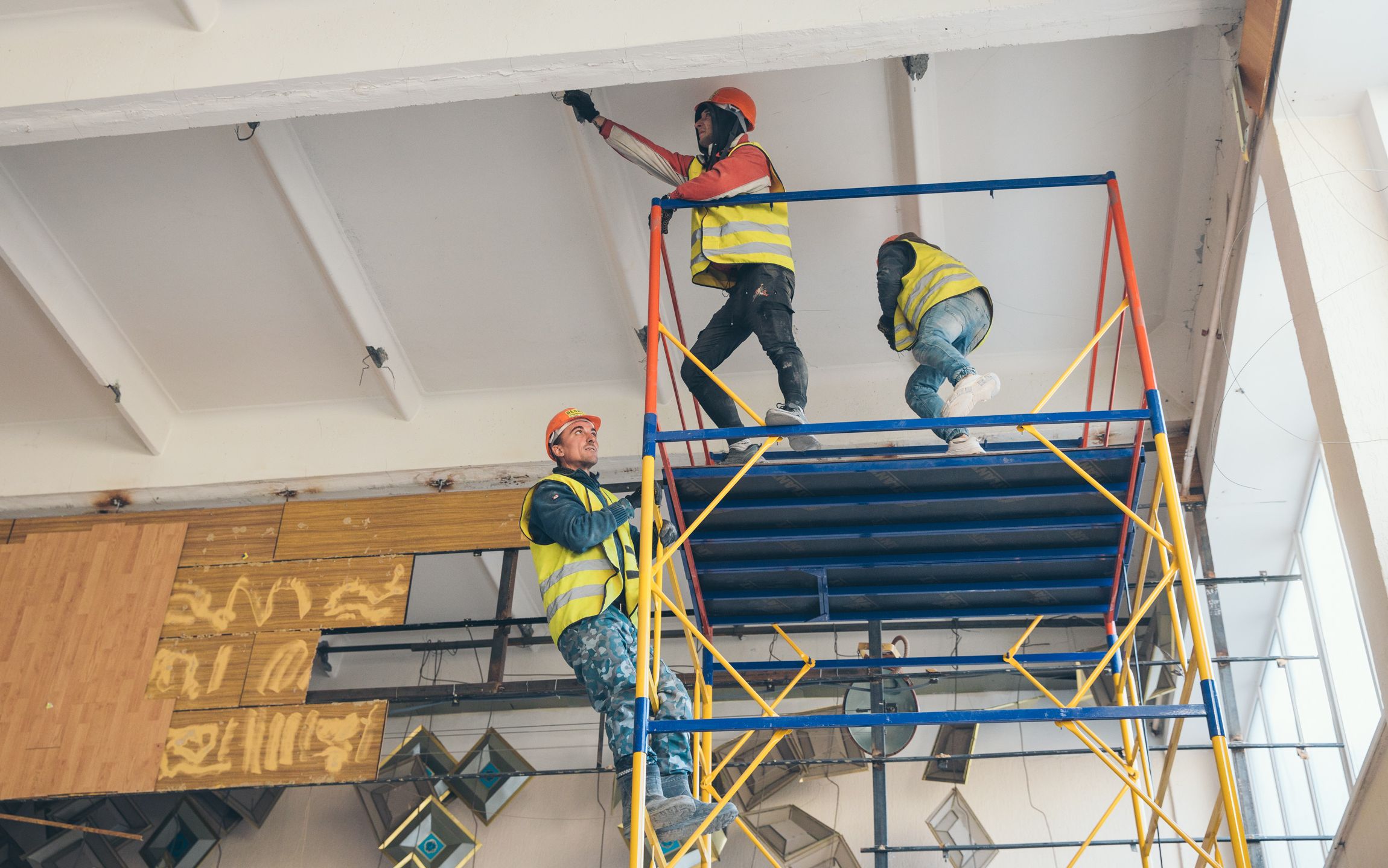 - Демонтаж існуючих конструкцій підлог, стін, стелі: вибивання нових, розширення старих та їх посилення.